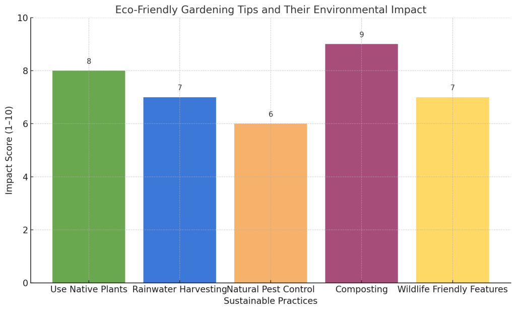 This chart highlights five simple yet powerful ways to make your garden greener — both literally and environmentally! Each practice is scored on an impact scale from 1 to 10, giving you a sense of how much good it can do for the planet.