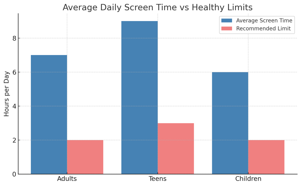 This chart shows how much screen time people typically have compared to what’s considered healthy: